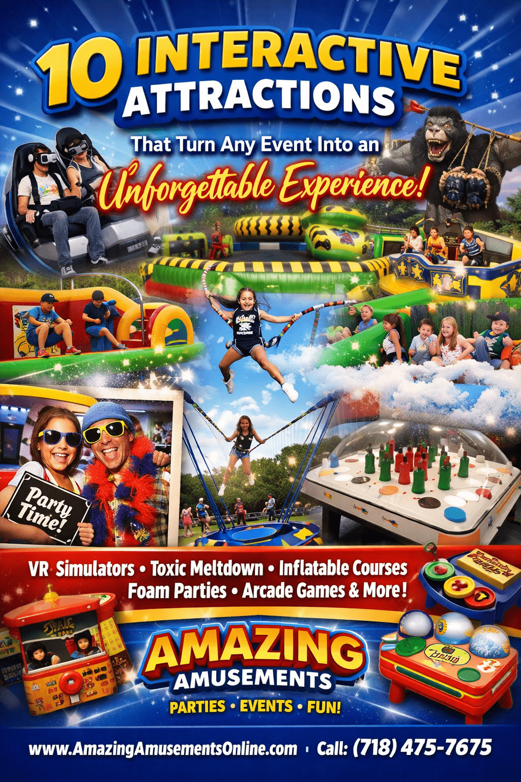 At Amazing Amusements, we specialize in high-impact, interactive event rentals that transform ordinary events into unforgettable experiences. Here are 10 interactive attractions that consistently steal the spotlight and keep guests talking long after the event ends.
